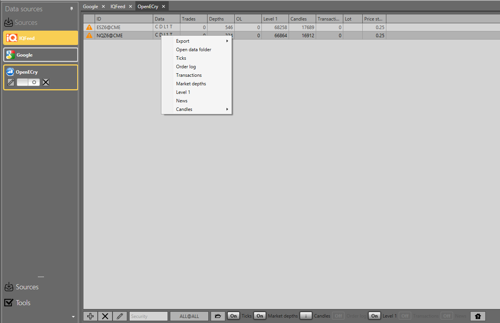 After all the previous procedure, we have got added sources in the left pane, all of which must now be set up. IQFeed supports a very wide range of parallel subscriptions, as well as a much greater depth of history, both for candles and tick data.